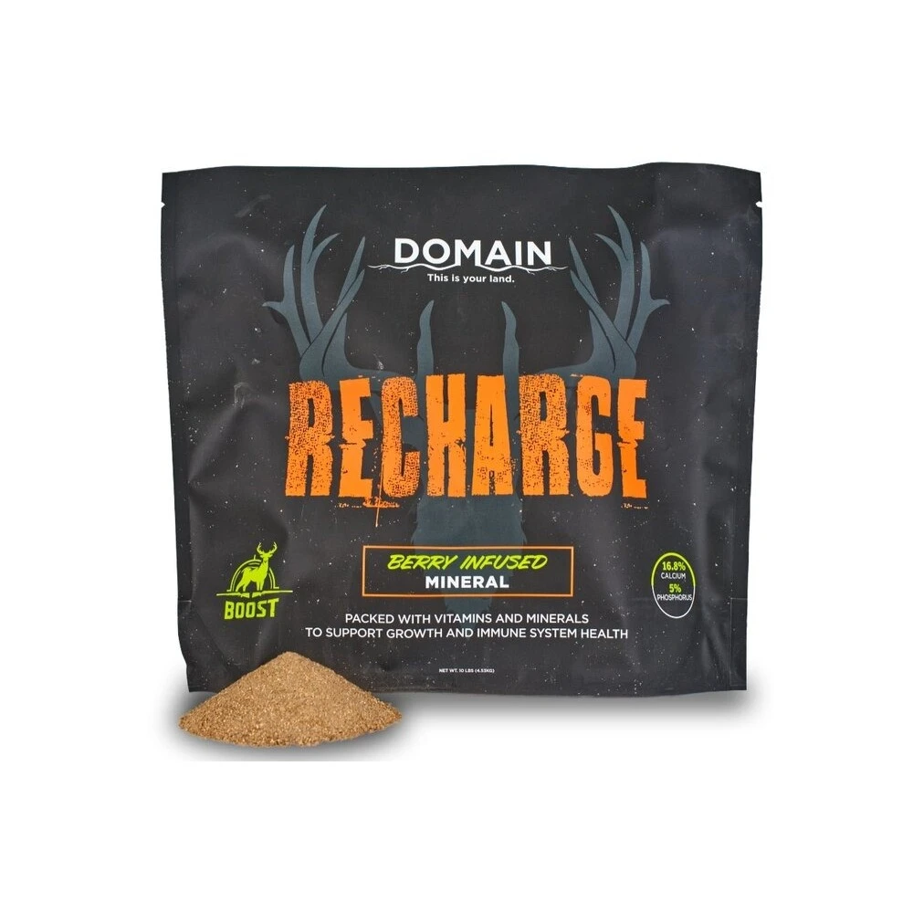 Packed with vitamins and minerals to support growth and immune system health, Domain’s Recharge Deer Mineral is a specially formulated mineral-based multi-vitamin supplement designed to support growth and immune system health. Enhanced with berry infused flavoring and aroma, Recharge is high digestible and provides maximum nutrient availability and absorption. Recharge Deer Mineral is designed to offer your deer herd a well-rounded mineral and vitamin supplement to support overall health and can play a key role in your year-round deer management program. Pour one bag of Recharge Deer Mineral directly on the ground or an old stump and refresh every 2-3 weeks. Greatest consumption will occur from March through August as antlers and fawns are growing, although it is recommended to offer it free choice on a year-round basis