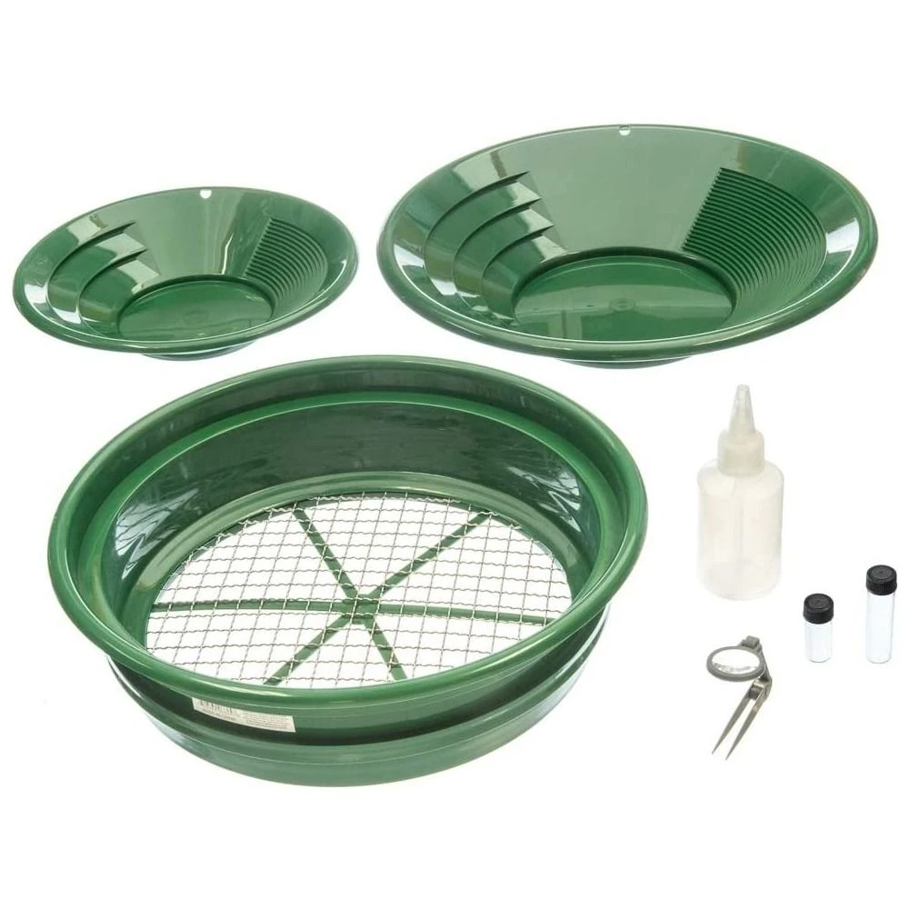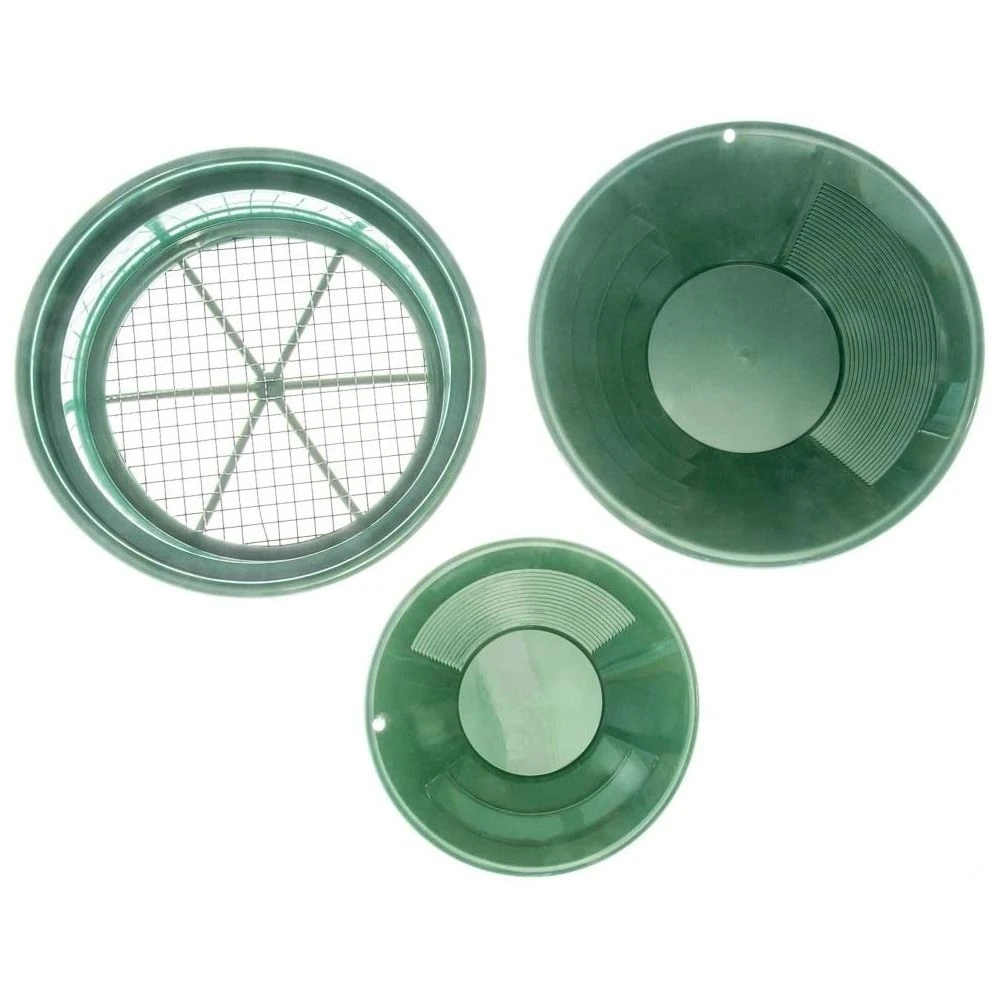 - 10″ and 14″ dual riffle gold pan, patented 1/2″ mesh sifting pan